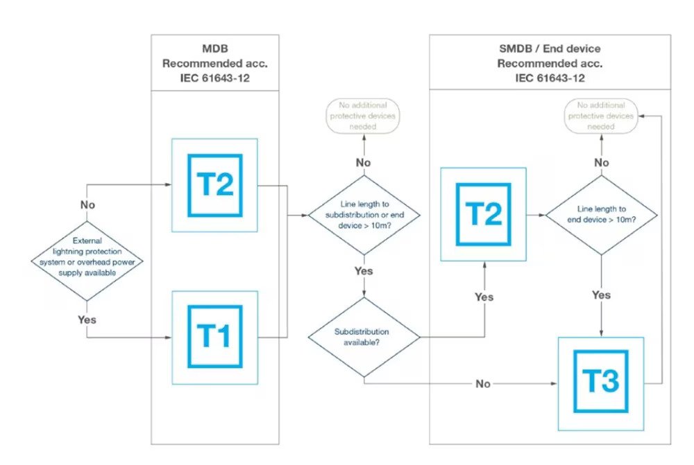 - T1 (bleskový): Instalace v hlavním rozvaděči za HDS. Používá se tam, kde hrozí přímé nebo blízké údery blesku nebo je na objektu hromosvod/LPS. Úkol: převzít nejhrubší energii.